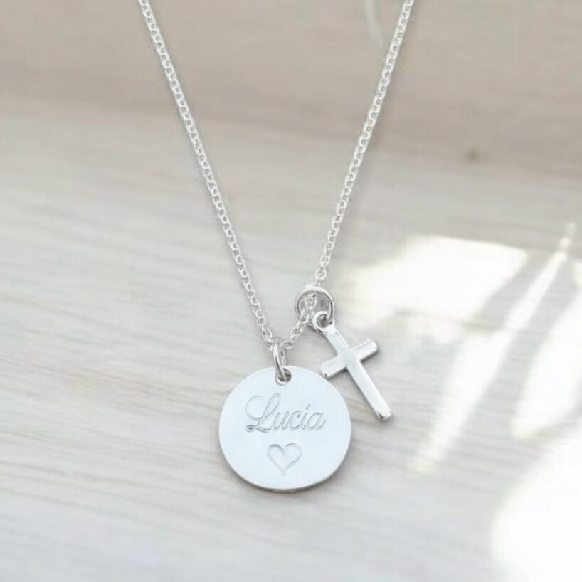 Un detalle único y lleno de significado. Este delicado collar infantil está elaborado en plata de alta calidad e incluye una medalla grabada con el nombre que elijas, acompañada de una elegante cruz colgante que aporta un toque especial y simbólico.